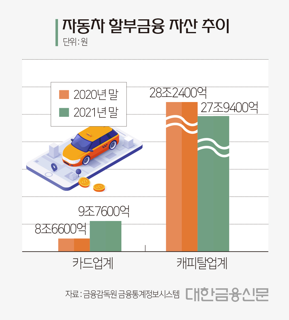 금융감독원 금융통계정보시스템에 따르면 지난해말 카드업계 자동차 할부금융 자산은 9조 7600억원으로 전년 8조6600억원 대비 12.7%(1조1000억원) 늘었다. 같은 기간 캐피탈업계 자동차 할부금융 자산은 28조2400억원에서 27조9400억원으로 1.1%(3000억원) 줄었다.