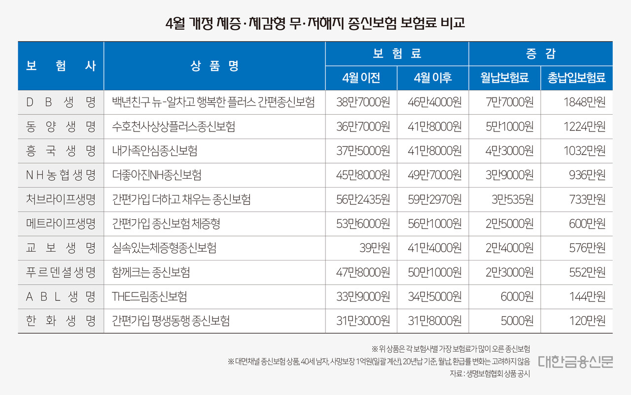 NH농협생명의 '더좋아진NH간편가입종신보험'의 총납입보험료는 1억2576만원으로 개정 전 보다 948만원 늘었다. 이어 흥국생명 '다(多)사랑착한종신보험', 라이나생명 'THE건강해지는종신보험'의 보험료는 각각 672만원, 648만원 증가했다.