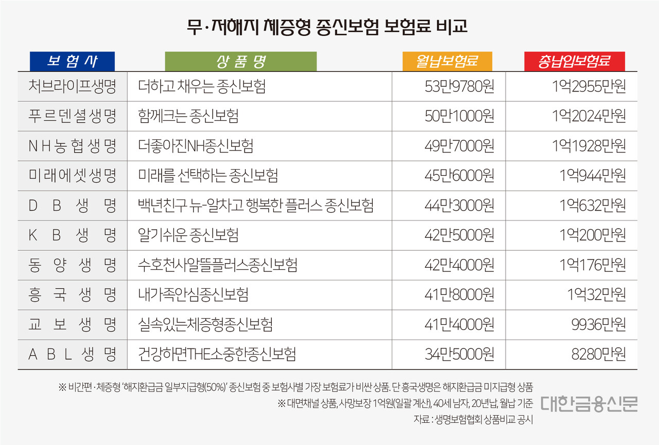 총납입보험료가 1억원을 넘지 않는 상품은 교보생명의 '실속있는체증형종신보험'과 ABL생명의 '건강하면THE소중한종신보험' 2개다. 이에 최저가와 최고가의 총 납입보험료 차이는 무려 4675만원까지 벌어졌다.