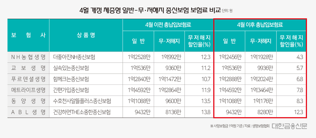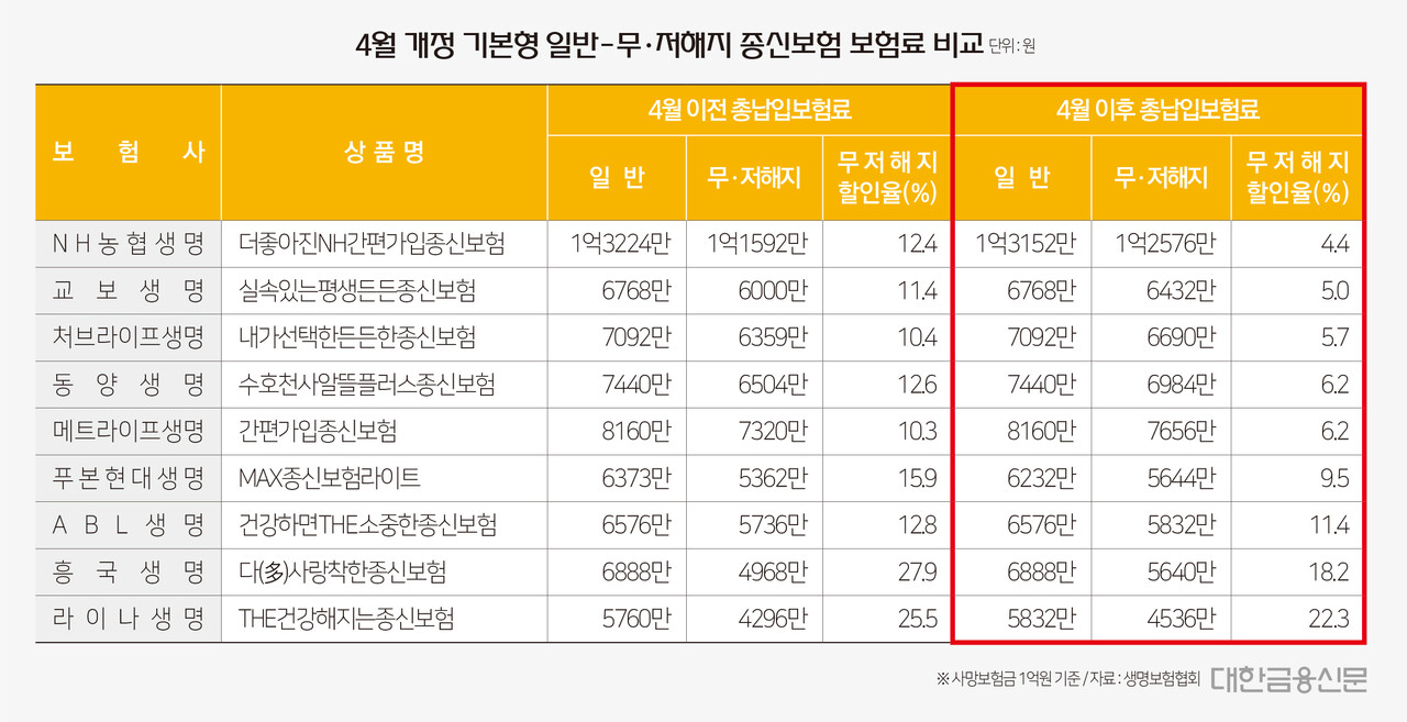 기본형 종신보험 중 일반 상품과 무·저해지 보험료의 차이가 가장 적은 상품은 NH농협생명의 '더좋아진NH간편가입종신보험'으로 나타났다. 기존에 일반 종신의 총납입보험료가 1억3224만원, 무·저해지는 1억1592만원으로 할인율이 12.4%였던 해당 상품은 4월 이후 일반 1억3152만원, 무·저해지 1억2576만원으로 조정돼 할인율이 4.4%까지 떨어졌다.