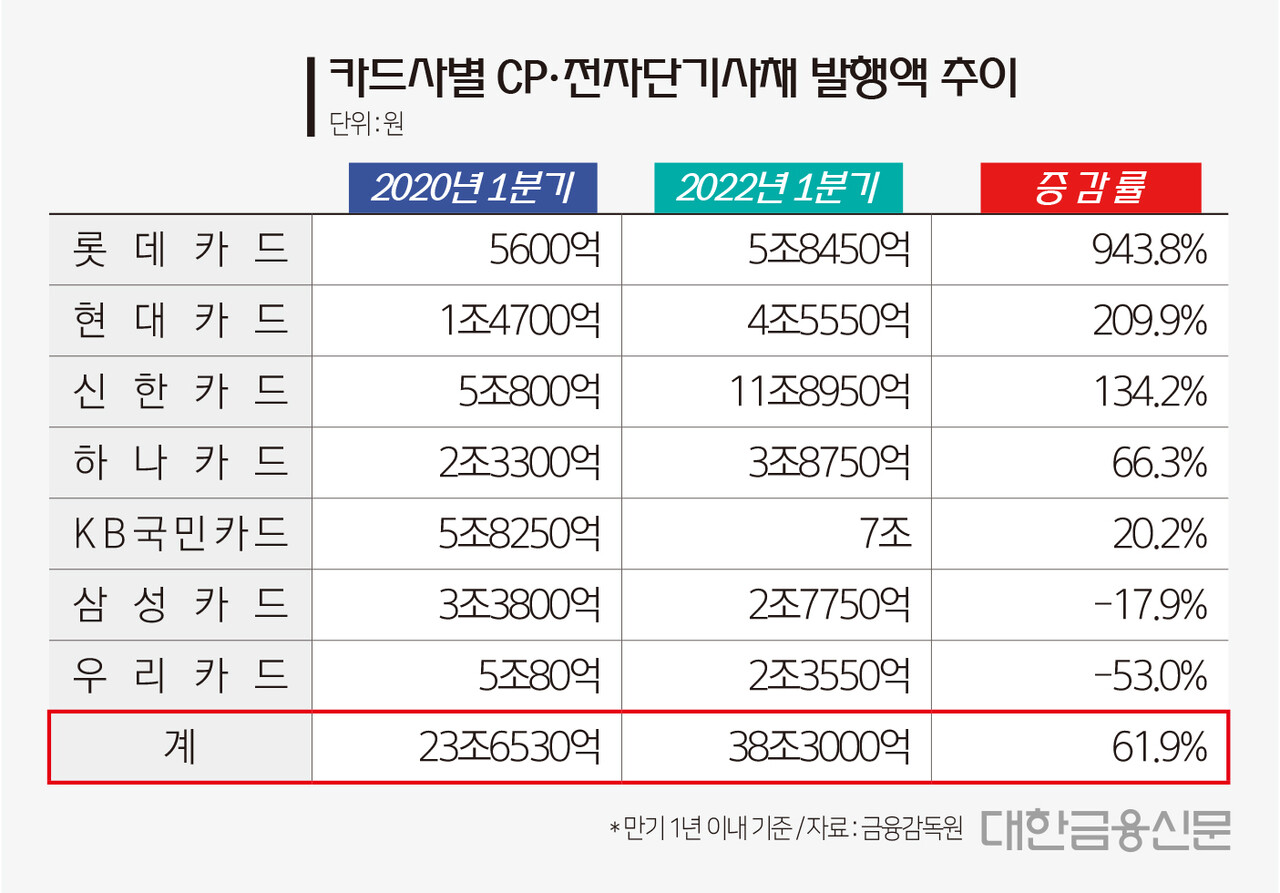 금융감독원에 따르면 2022년 1분기 BC카드를 제외한 7개 전업카드사의 만기 1년 이내 기업어음(CP) 및 전자단기사채 발행액은 38조원으로 지난 2020년 동기 대비 62% 상승했다.