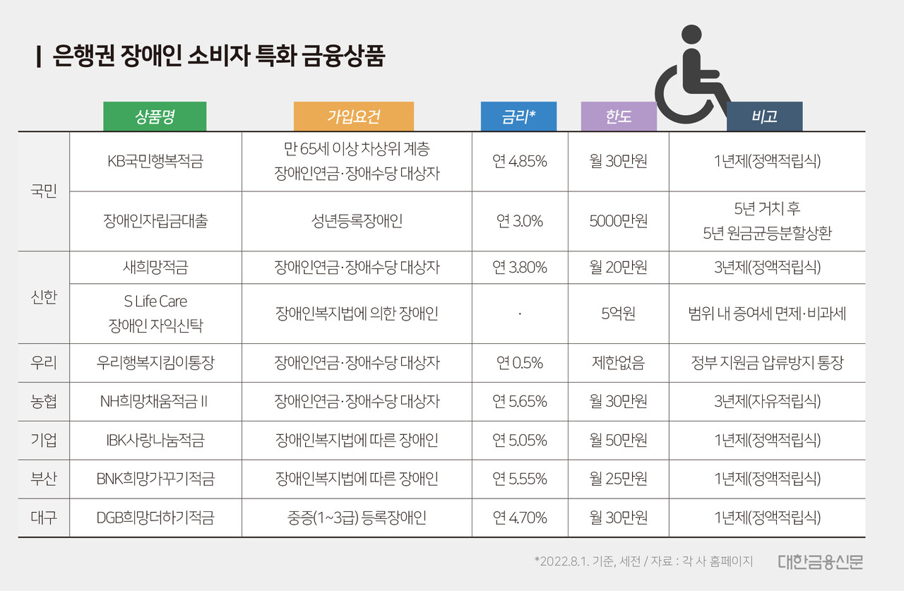 두 상품은 장애인 소비자 중에서도 만 65세 이상 차상위(KB국민행복적금), 중증 장애(DGB희망더하기적금)로 가입에 제한을 둔다.
