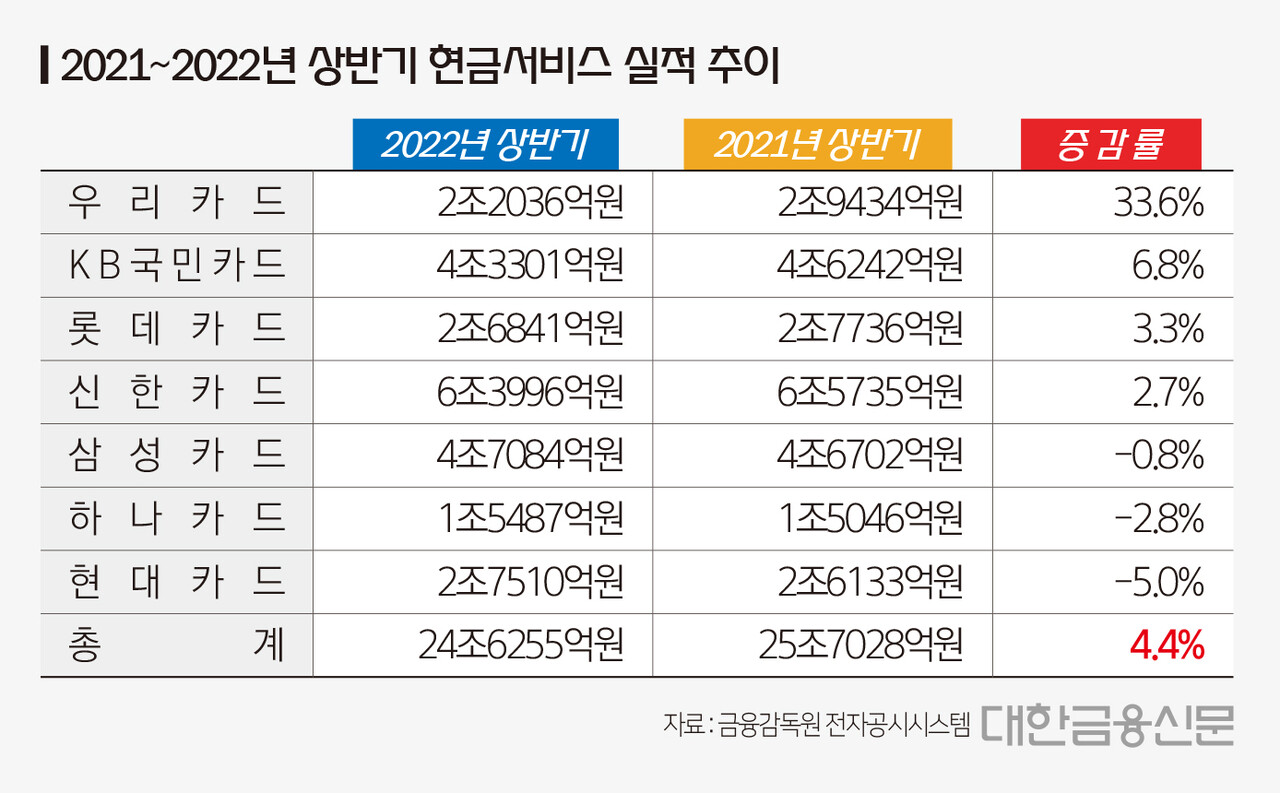 올 상반기 BC카드를 제외한 7개 전업카드사의 현금서비스 취급 실적액은 25조7028억원으로 전년 동기 대비 4.4% 증가했다.