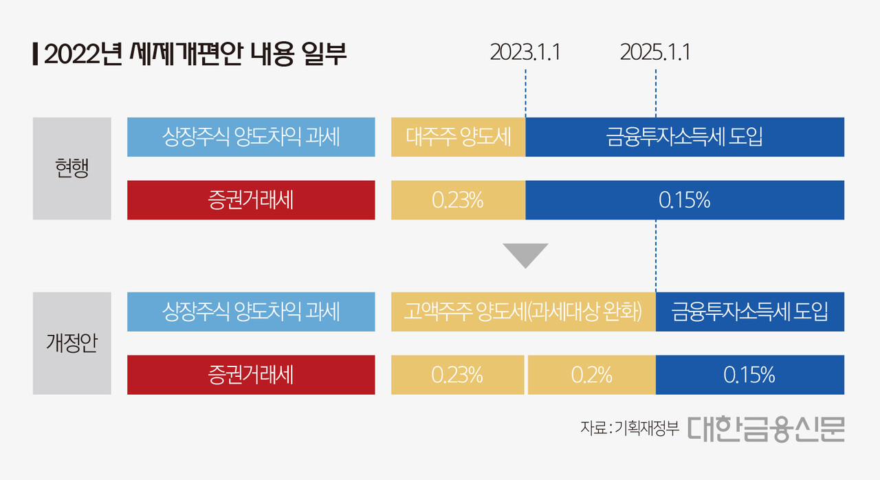 개정안은 현재 0.23% 수준인 증권거래세를 내년에 0.2% 수준으로 인하하고 금융투자소득세 도입을 통해 0.15%로 낮추겠다는 내용을 담고 있다. 내년 초 시행을 앞뒀던 금융투자소득세 부과는 2년간 유예하기로 했다.