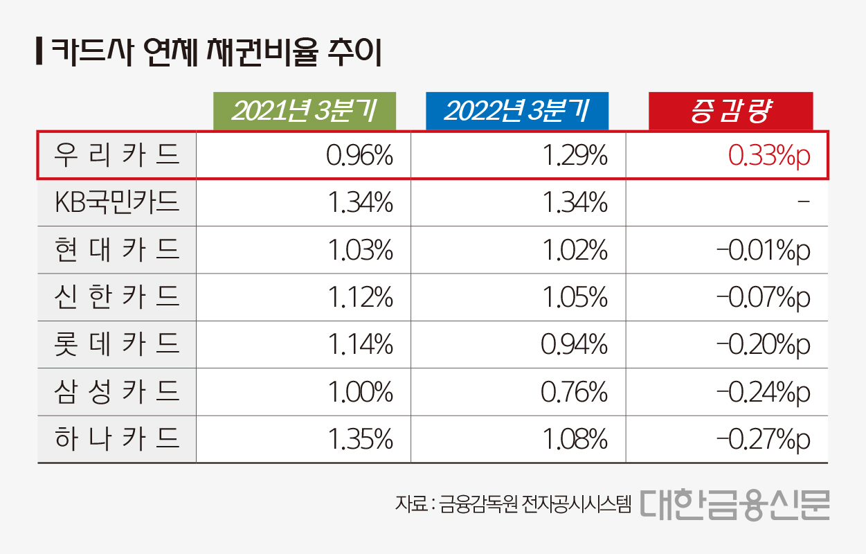 금융감독원 전자공시에 따르면 올 3분기 우리카드 연체 채권비율은 1.29%로 전년 동기(0.96%) 대비 0.33%포인트 증가했다.