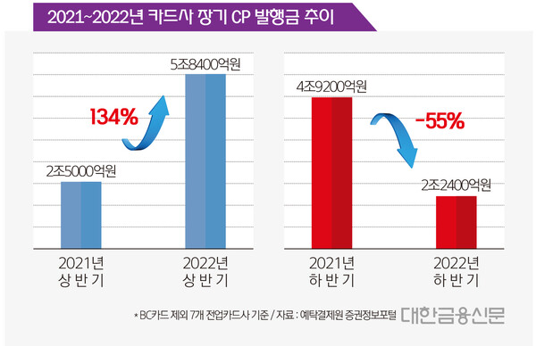 예탁결제원 증권정보포털에 따르면 BC카드를 제외한 7개 전업카드사가 지난해 하반기 발행한 장기 기업어음(CP)은 2조2400억원으로 전년 동기(4조9200억원) 대비 54.5% 감소했다.
