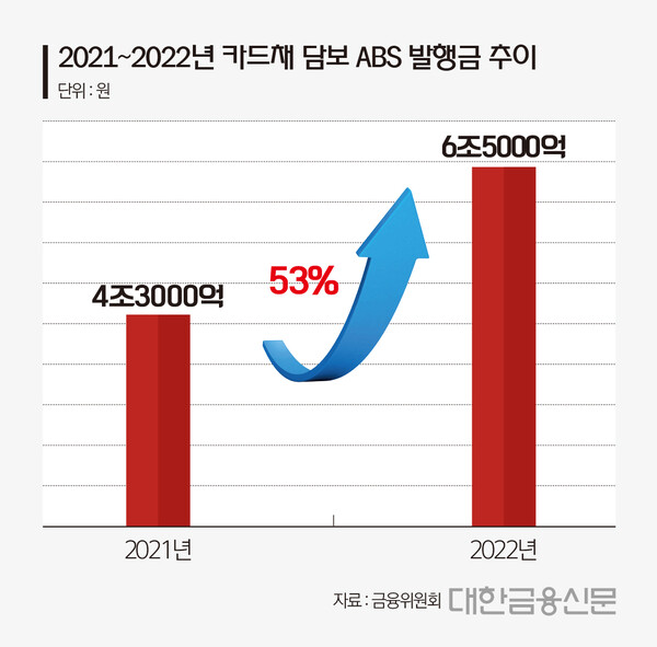 금융위원회가 최근 발표한 ‘2022년 ABS 등록발행 실적’에 따르면 지난해 카드채권을 담보로 한 ABS(자산유동화증권) 발행금은 6조5000억원으로 전년(4조3000억원) 대비 53% 증가했다.