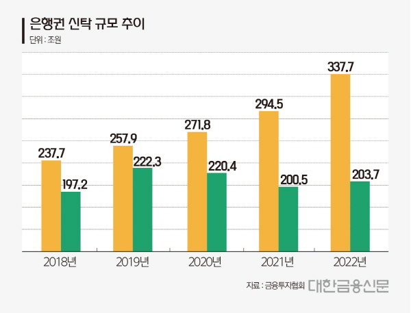 부문별로 보면 금전신탁이 지난 2018년 237조7107억원에서 2022년 337조7491억원으로 5년 새 42.08% 늘었고, 같은 기간 재산신탁은 197조2794억원에서 203조7386억원으로 3.27% 상승했다.