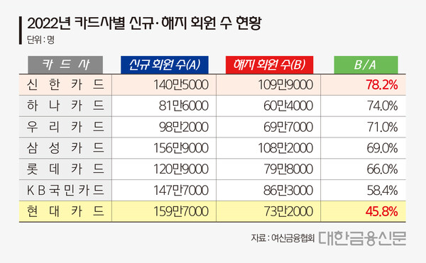 여신금융협회에 따르면 지난해 신한카드 신규 회원 수 대비 해지 회원 수 비율은 78.2%로 집계됐다. 이어 △하나카드 74.0% △우리카드 71.0% △삼성카드 69.0% △롯데카드 66.0% △KB국민카드 58.4% △현대카드 45.8% 순으로 나타났다.