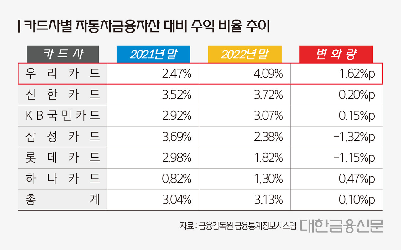 금융감독원 금융통계정보시스템에 따르면 지난해 우리카드 자동차 할부금융 자산 대비 수익금 비율은 4.09%로 전년(2.47%) 대비 1.62%포인트 증가했다.
