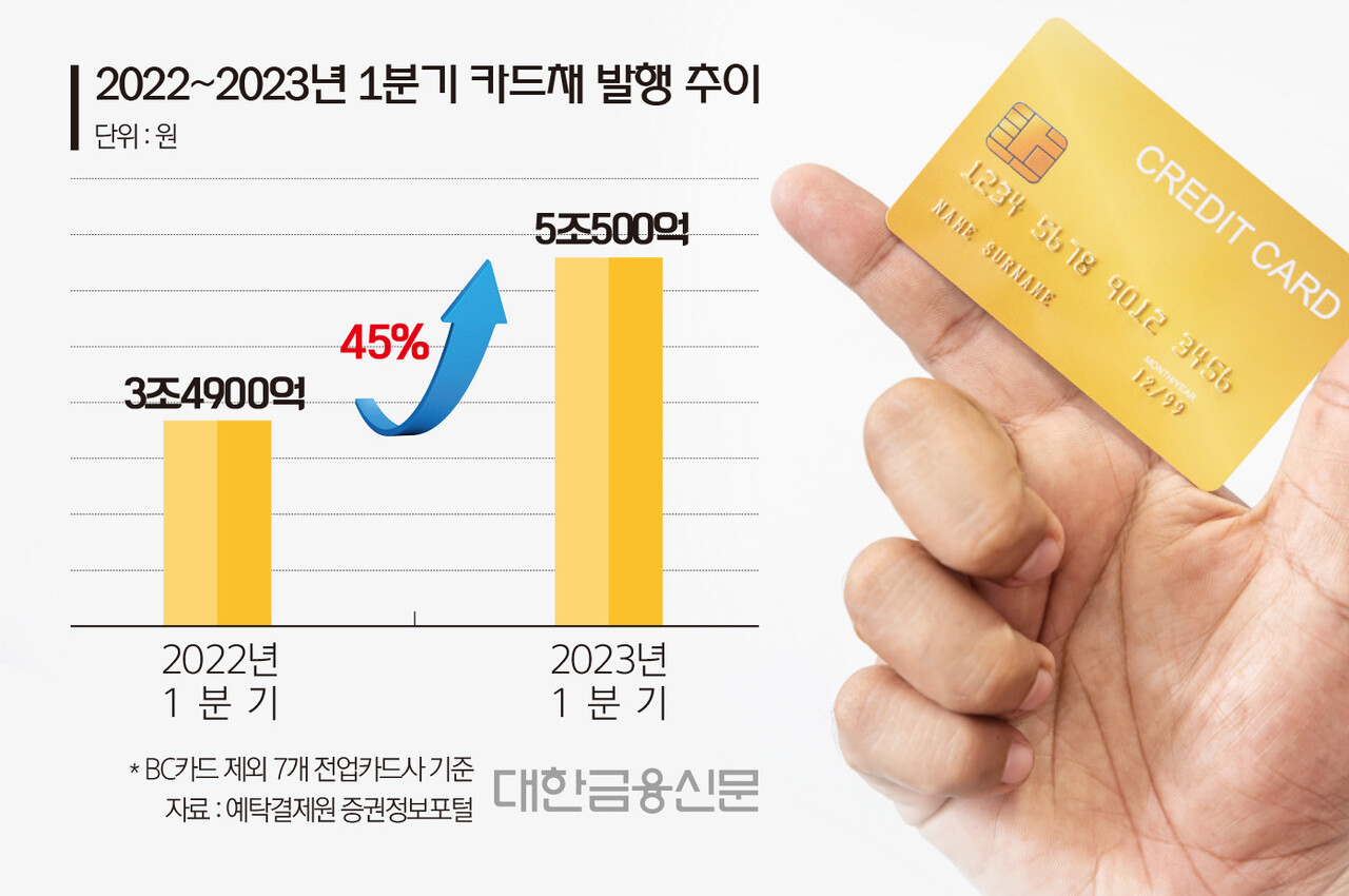 예탁결제원 증권정보포털에 따르면 올 1분기 BC카드를 제외한 7개 전업카드사가 발행한 회사채는 5조500억원으로 전년 동기(3조4900억원) 대비 45% 증가했다.