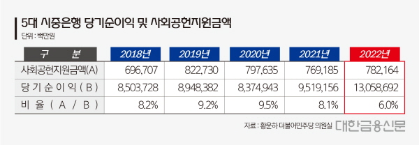 같은 기간 사회공헌지원금액 합계는 7821억원으로 당기순이익의 6.0% 비율을 차지했다. 이는 지난 2018년 8.2%, 2019년 9.2%, 2020년 9.5%, 2021년 8.1%와 비교해 가장 낮은 수치다.