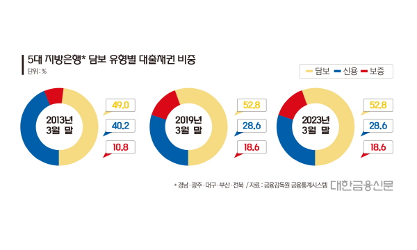 경남·광주·대구·부산·전북 등 5대 지방은행의 담보대출 비중은 지난 2013년 3월 49%에서 올 3월 53.2%로 4.2%포인트 높아졌고, 보증서대출 비중 역시 10.8%에서 21%로 10.3%포인트 올랐다. 같은 기간 신용대출 비중은 40.2%에서 25.8%로 14.5%포인트가 떨어졌다.