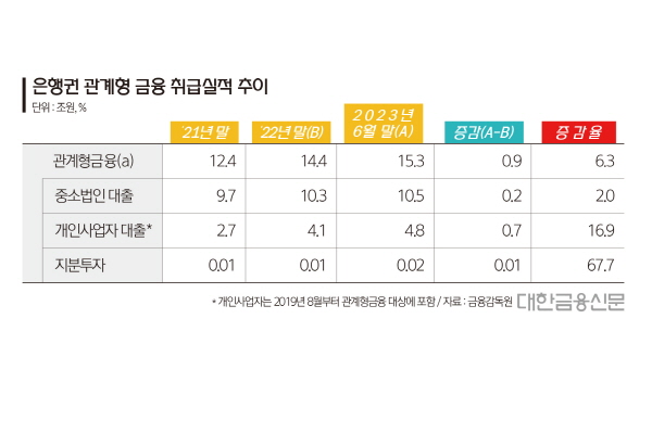 11일 금융감독원에 따르면 지난 6월 말 기준 관계형 금융 잔액은 15조3000억원으로 지난해 말(14조4000억원) 대비 9000억원(6.3%) 증가했다. 이는 상반기 중소기업 대출 증가율(2.2%)의 약 3배 수준이다.