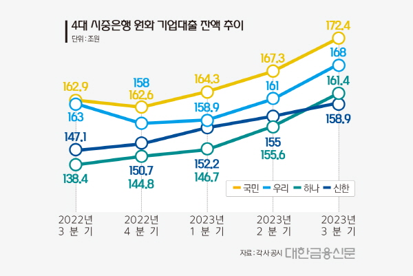 2일 4대 금융지주 기업설명(IR) 자료에 따르면 하나은행의 올 3분기 기준 기업대출 잔액은 161조4000억원으로 전년 동기(138조4000억원) 보다 16.61% 증가하며 4대 시중은행 중 가장 큰 폭으로 성장했다.