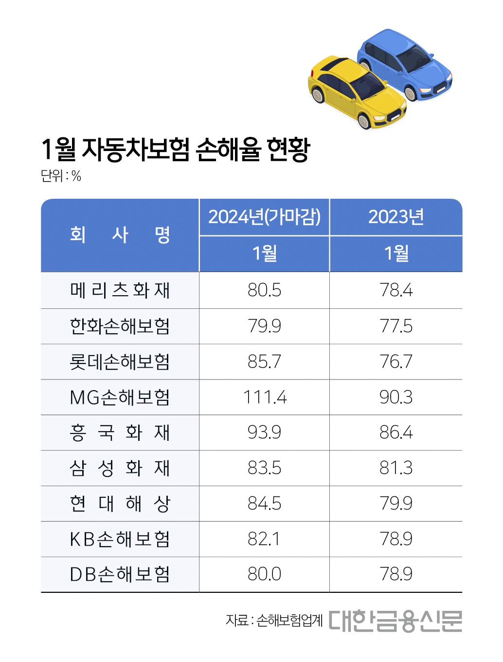 자동차보험 점유율 85%를 차지하는 상위 4개사의 올해 1월 자동차보험 손해율(가마감)은 삼성화재 83.5%, 현대해상 84.5%, DB손해보험 80.0%, KB손해보험 82.1%를 기록했다.