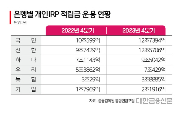 한편 금융감독원 통합연금 포털을 보면 지난해 4분기 기준 농협은행과 기업은행의 개인IRP 적립금 운용금액은 각각 3조8885억원, 2조1916억원으로 시장 선도사로 평가받는 신한은행(12조7394억원), 국민은행(12조5706억원)의 반의 반 토막 수준에도 못 미친다.