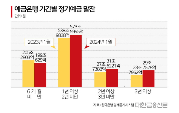 국내 예금은행의 지난 1월 기준 기간별 정기예금 말잔을 보면 △1년 이상 2년 미만 잔액은 573조5995억원으로 전년 동월(538조9838억원) 대비 6.42%(34조6156억원) 늘었다.