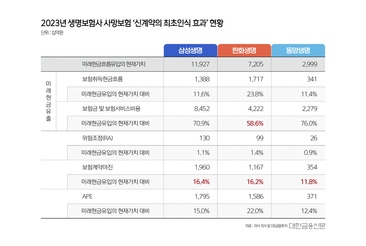 지난해 한화생명의 사망보험 신계약에서 비롯된 미래현금유입의 현재가치는 7조2050억원으로 삼성생명(11조9270억원)보다 4조7000억원 가량 낮다.