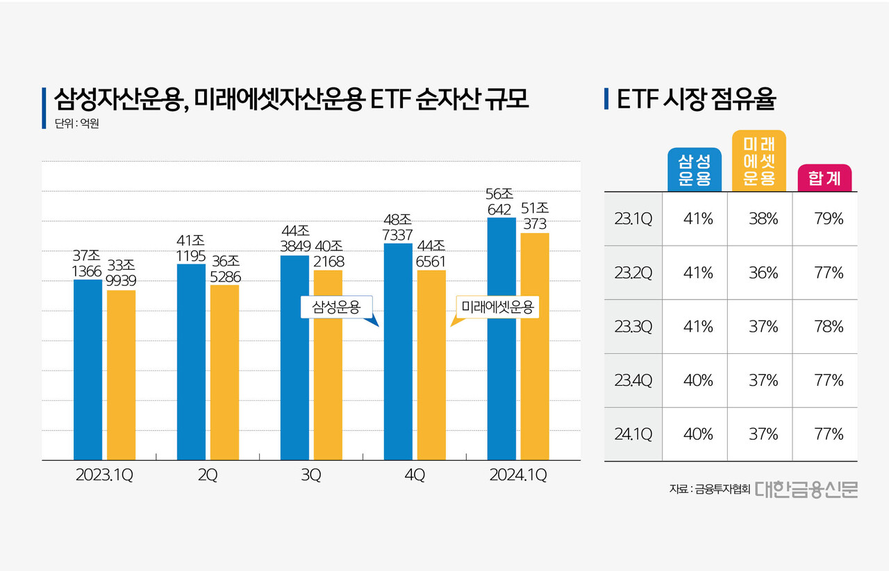 금융투자협회에 따르면 올해 1분기 말 기준 삼성자산운용과 미래에셋자산운용의 국내 상장 ETF 순자산 총액은 각각 56조642억원, 51조373억원으로 집계됐다.