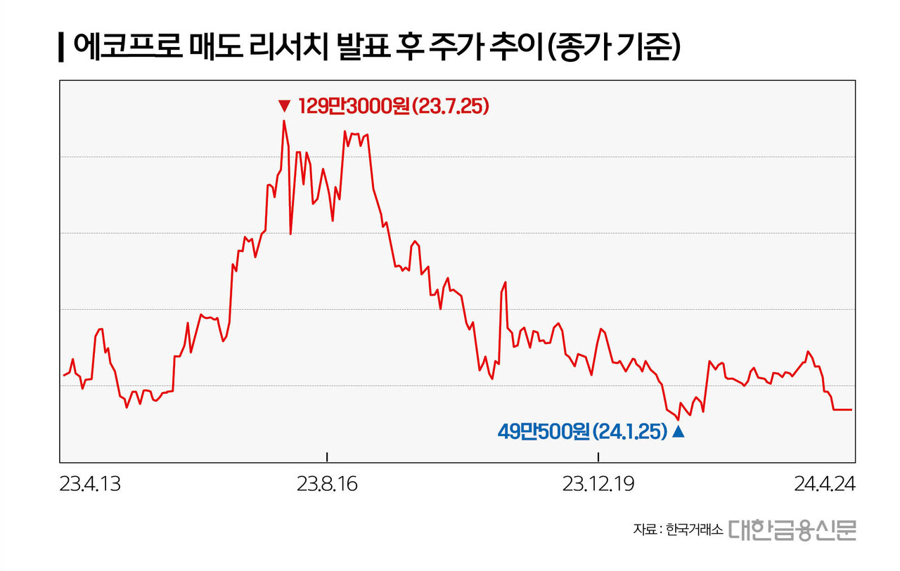 그럼에도 김 연구원은 꾸준히 매도 리서치를 발표하며 경고 메시지를 던졌다. 그의 예측대로 에코프로 주가는 작년 여름을 정점으로 우하향을 그렸다.