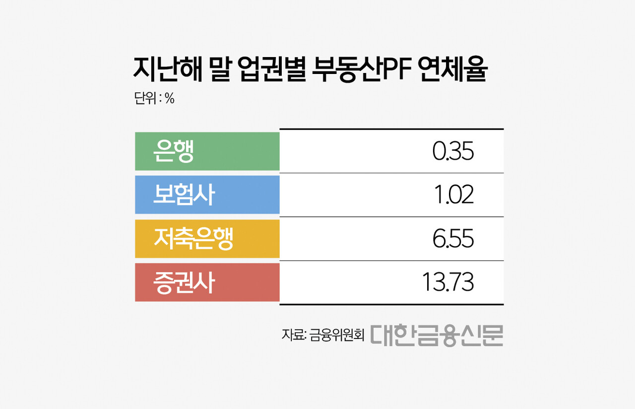 양 업권의 부동산PF 대출 연체율은 지난해 말 기준 은행 0.35%, 보험 1.02%로 양호한 편이다. 같은 기간 저축은행은 6.55%, 증권사는 13.73%의 연체율을 기록했다.