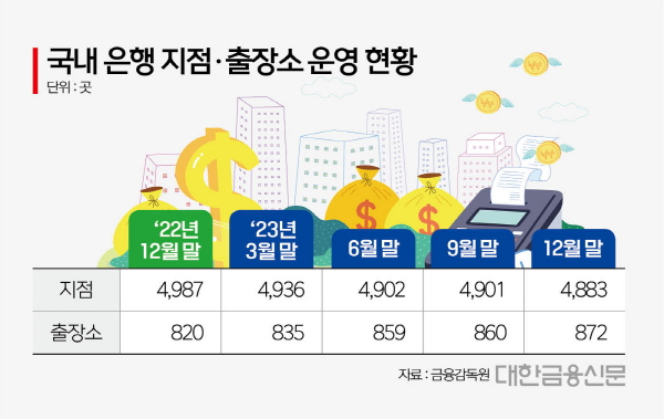 16일 금융감독원에 따르면 지난해 말 기준 국내 19개 은행의 지점 수는 총 4883곳으로, 전년 말(4987곳) 보다 104곳이 줄었다. 같은 기간 출장소는 820곳에서 872곳으로 52곳 늘어난 것으로 집계됐다.
