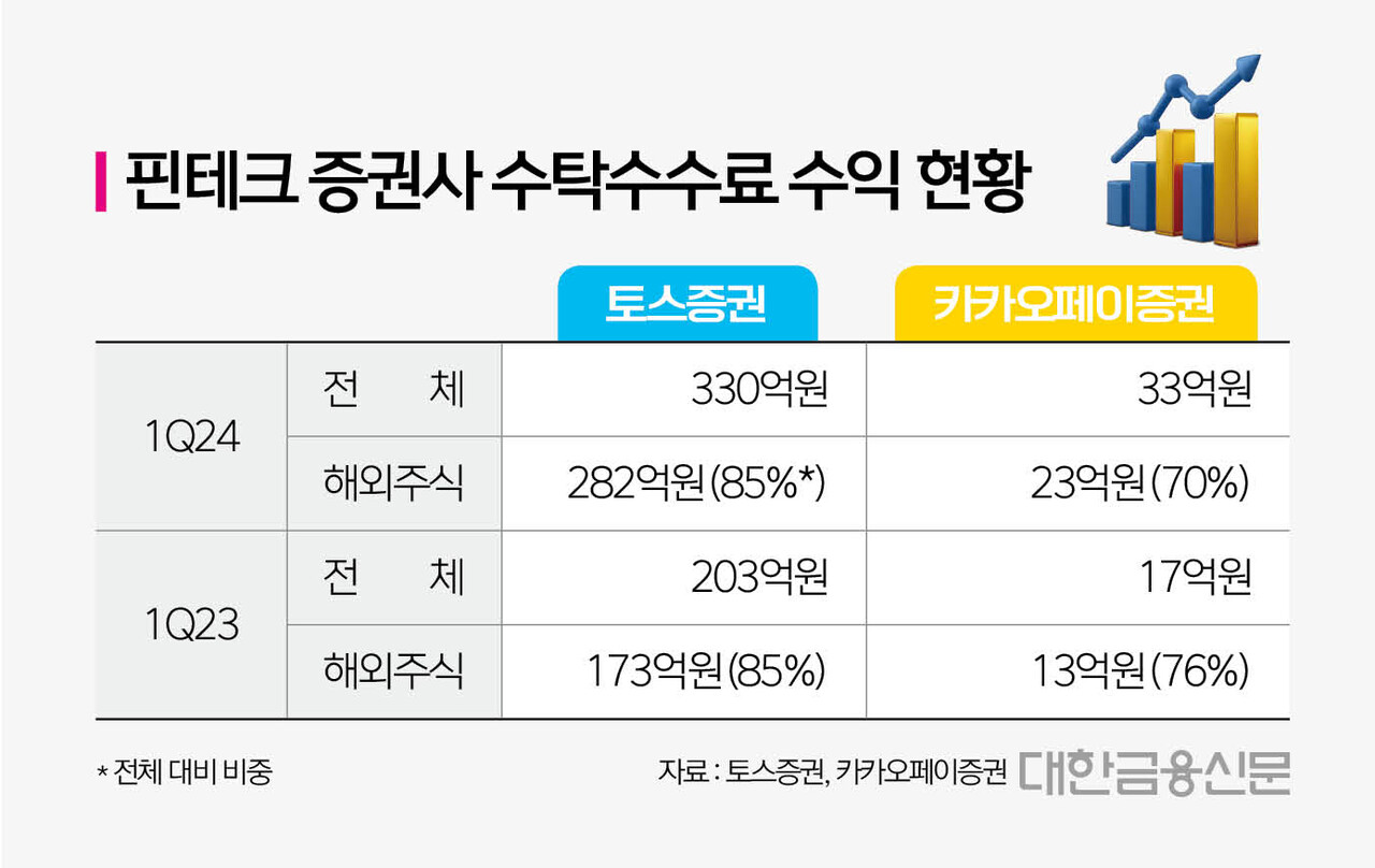 양 사 모두 전체 수탁수수료의 대부분을 해외주식 부문에서 창출하고 있다. 토스증권과 카카오페이증권의 해외주식 수탁수수료 비중은 전체의 각각 85%, 70%를 차지한다.