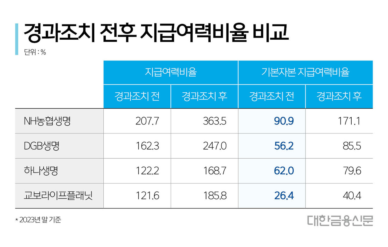 소형사 중에서는 지난해 말 기준 DGB생명, 하나생명, 교보라이프플래닛생명의 기본자본지급여력비율이 각각 56.2%, 62.0%, 26.4% 등을 기록하고 있다.