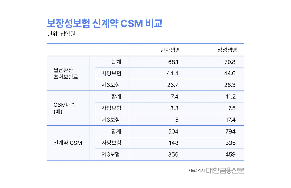 반면 CSM은 크게 차이가 났다. 이 기간 한화생명의 사망보험 신계약 CSM은 1480억원으로 3350억원을 거둔 삼성생명의 절반 수준에 그쳤다.