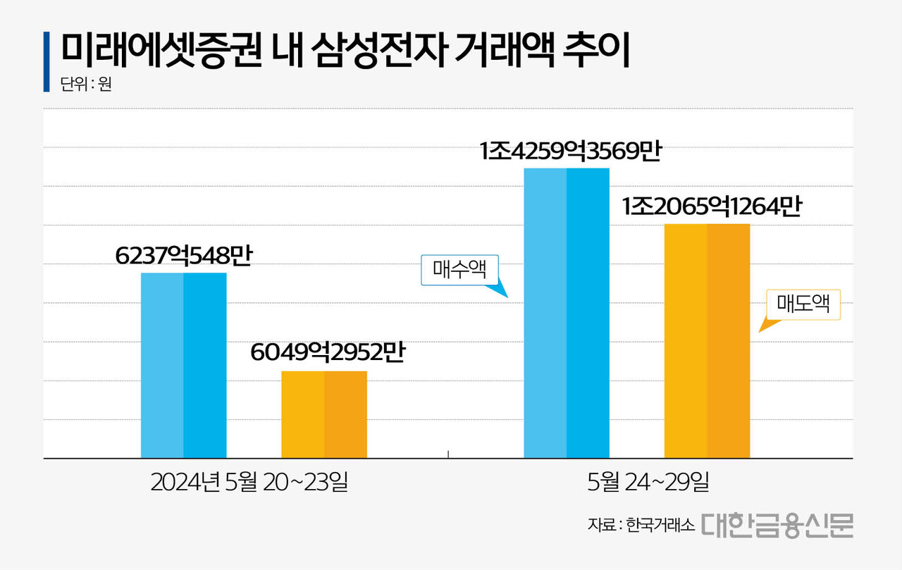20일부터 23일까지 미래에셋에서의 삼성전자 매수금액과 매도금액은 각각 6237억·6049억원이었다. 증권사별 거래 규모로 보면 이베스트투자증권에 이어 2위였다.