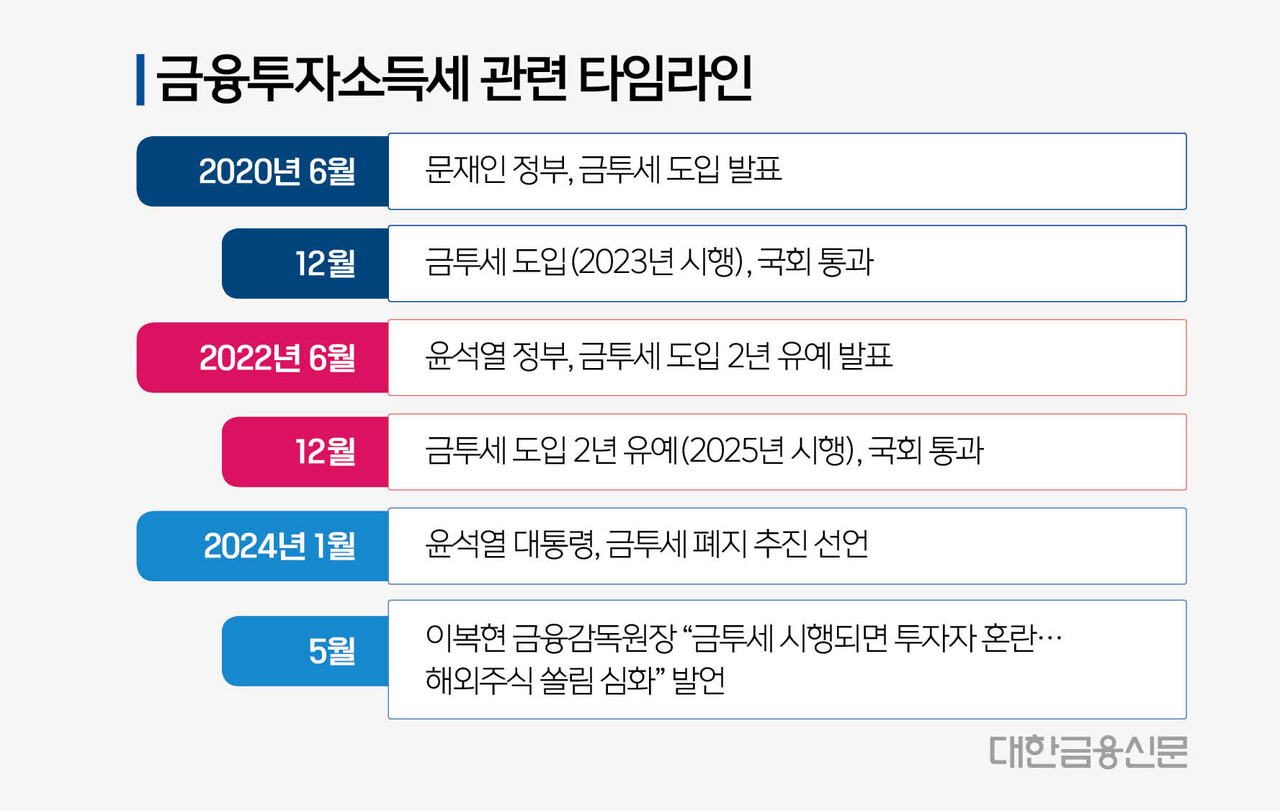 지난달 31일 이복현 금융감독원장은 금투세 관련 간담회를 마친 뒤 기자들과의 자리에서 "금투세가 시행되면 해외주식 쏠림이 심화하고 장기투자 대신 단기매매가 촉발되는 요인이 될 것"이라고 말했다. 그러면서 금투세 관련 논의에 적극 참여하겠다는 의사를 밝혔다.