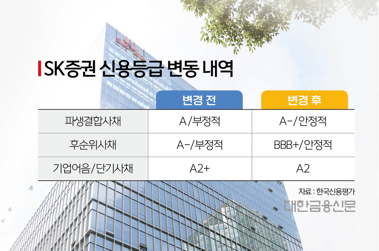 12일 금융투자업계에 따르면 최근 한국신용평가는 SK증권의 파생결합사채(ELB, DLB) 신용등급을 ‘A/부정적’에서 ‘A-/안정적’으로 강등했다. 후순위사채와 기업어음 및 단기사채 등급도 한 단계씩 내렸다.
