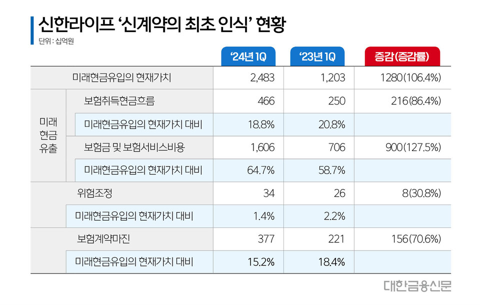 올 1분기 신한라이프의 신계약 최초인식 흐름을 살펴보면 미래현금유입의 현재가치는 2조4830억원으로 전년동기 대비 1조2800억원(106.4%) 크게 증가했다.