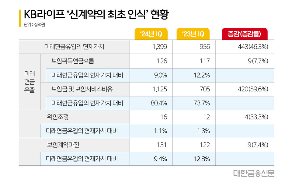 같은 기간 KB라이프의 미래현금유입의 현가는 1조3990억원으로 4430억원(46.3%) 늘었다. CSM은 1310억원으로 90억원(7.4%) 소폭 증가에 그쳤다.