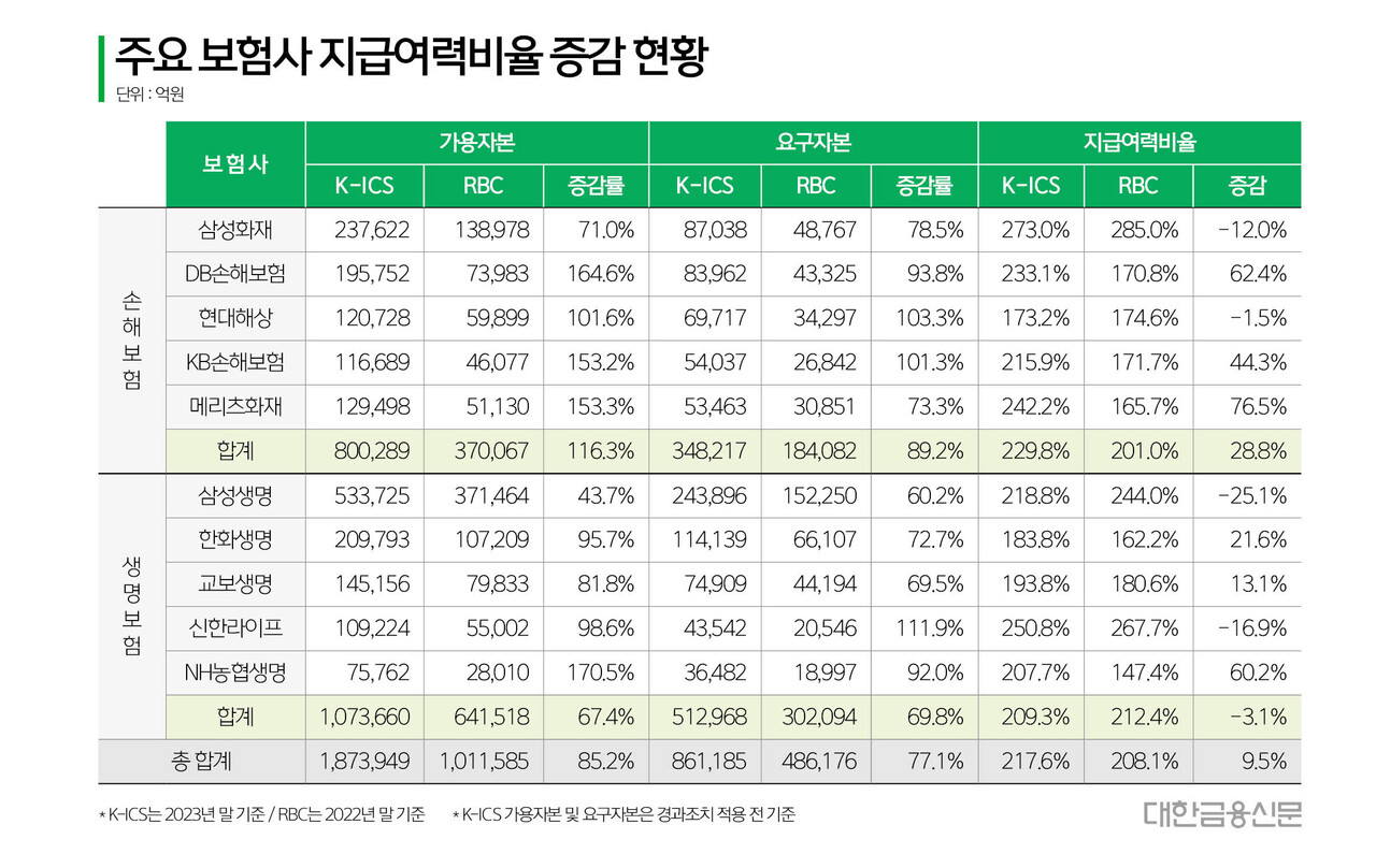 20일 보험업계에 따르면 생명·손해보험 상위 각 5개사의 지난해 말 기준 가용자본은 총 187조원 규모로 RBC 기준으로 산출하던 지난 2022년(101조원) 대비 약 86조원 늘어났다.
