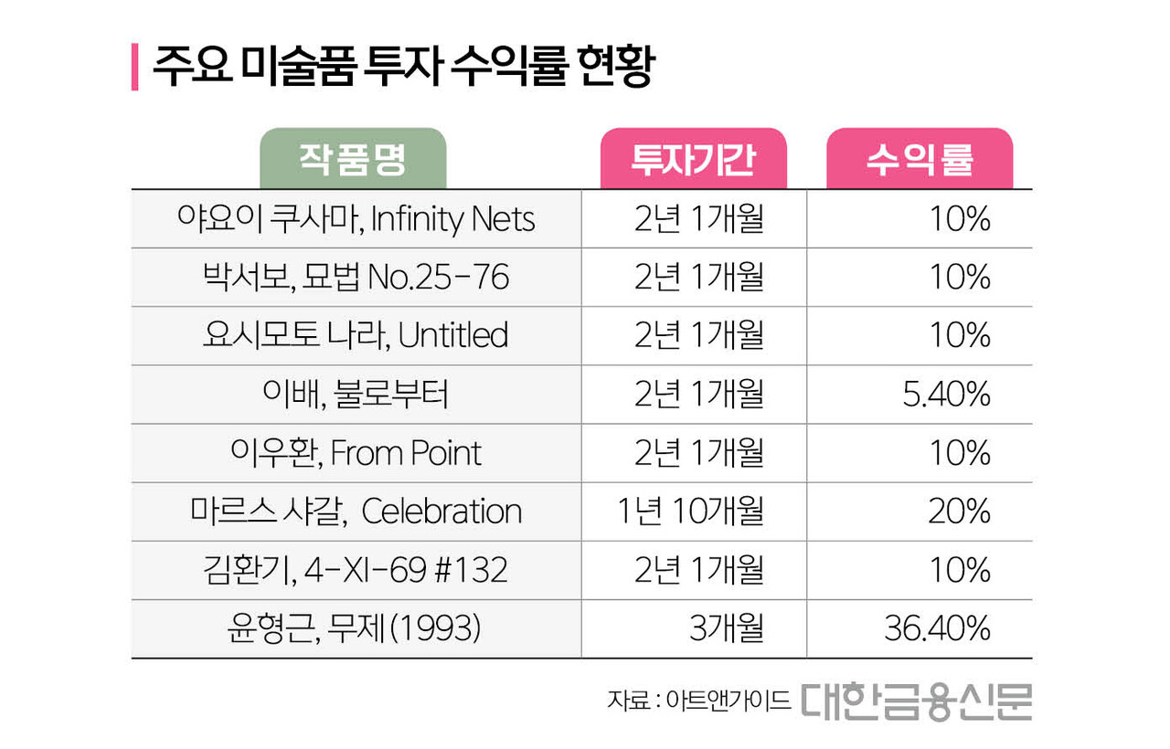 25일 아트앤가이드에 따르면 지난 2021년 이후 공동구매 뒤 매각된 미술품의 투자 기간은 평균 2년 내외, 수익률은 10~20% 안팎을 오가는 것으로 나타났다.