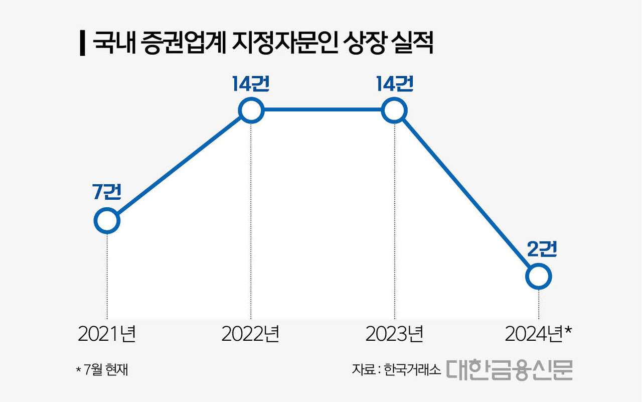 올해 지정자문 상장은 예년과 비교하면 부진한 편이다. 재작년과 작년에 증권업계에서 진행한 지정자문 상장은 각각 12건이었다. 상반기만 따로 놓고 보면 지난해엔 6건의 상장이 진행됐으나 금년에는 3분의 1 수준으로 줄었다.