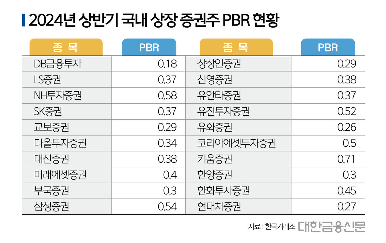 가장 낮은 값을 기록한 증권사는 DB금융투자로 0.18의 PBR을 나타냈다. 현대차증권, 상상인증권, 유화증권, 교보증권 등도 0.3을 밑돌았다.