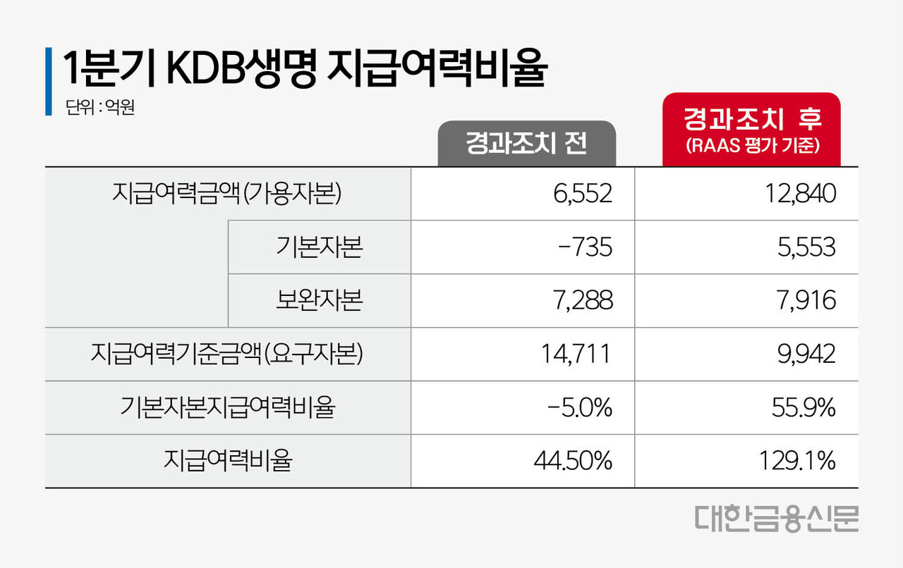 3일 KDB생명에 따르면 올해 1분기 경과조치 전 지급여력금액(가용자본)과 지급여력기준금액(요구자본)은 각각 6552억원, 1조4711억원으로 지급여력비율은 44.5%를 기록했다. 전분기 56.6% 대비 약 12%포인트(p) 악화된 결과다.