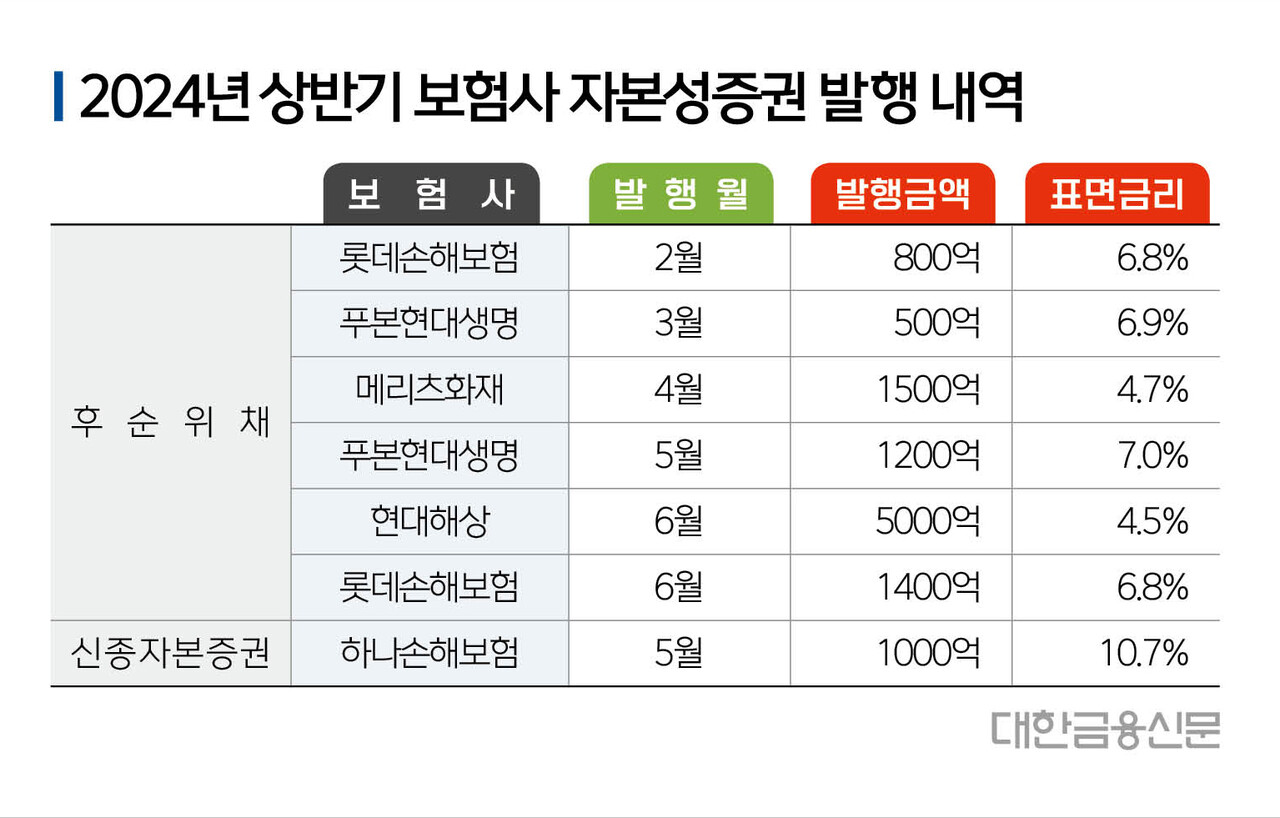 4일 보험업계에 따르면 올해 6월 말 현재까지 발행된 자본성증권(신종자본증권 및 후순위채)은 총 7건으로 이 중 하나손해보험이 발행한 사모 신종자본증권 1건을 빼면 전부 후순위채다.