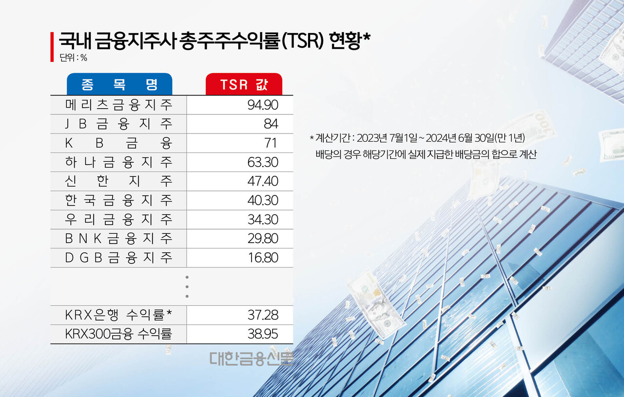 8일 대한금융신문이 국내시장에 상장된 금융지주사의 직전 4개 분기(2023년 3분기~2024년 2분기) TSR을 살펴본 결과 메리츠금융지주가 94.9%를 기록했다.