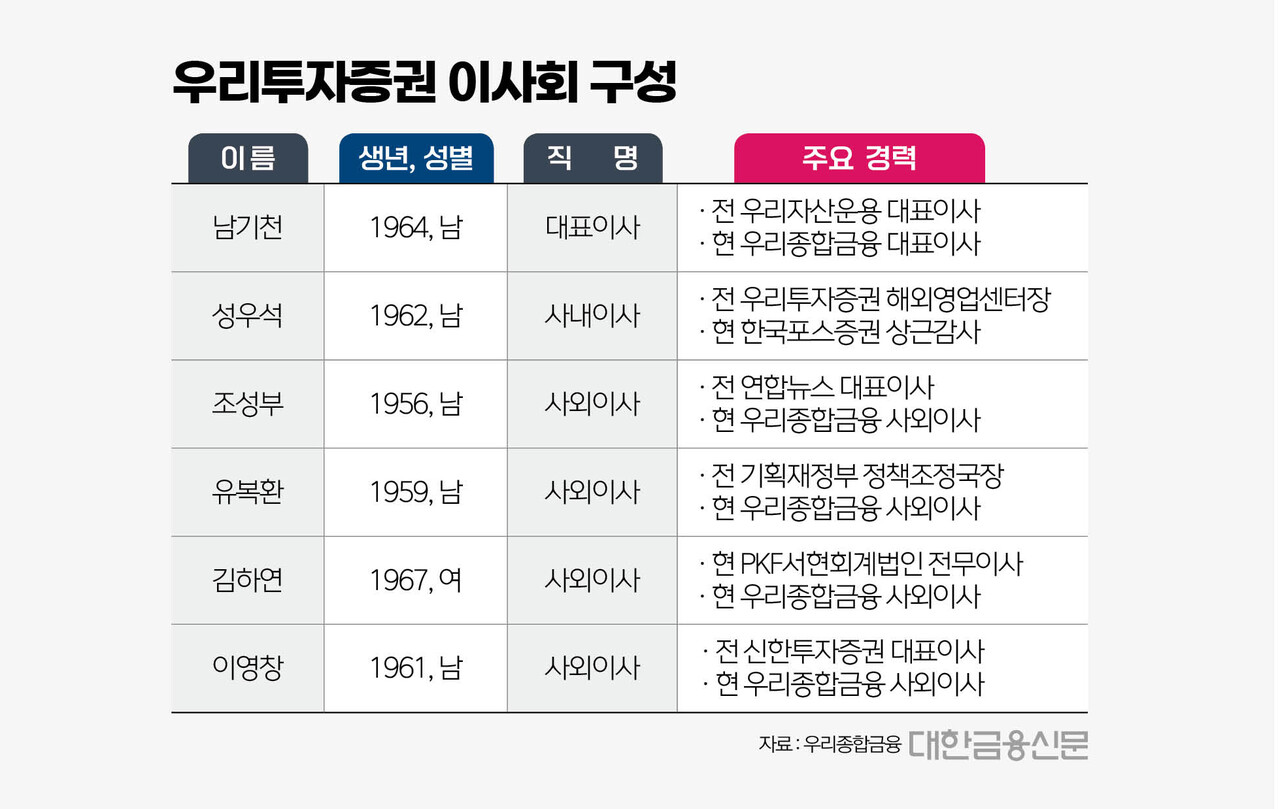앞서 우리종금의 사외이사진이자 향후 우리투자증권 사외이사진으로 활동할 3인(조성부·유복환·김하연)은 지난해 우리종금의 모든 중요의결사항에서 찬성표만 던졌다.