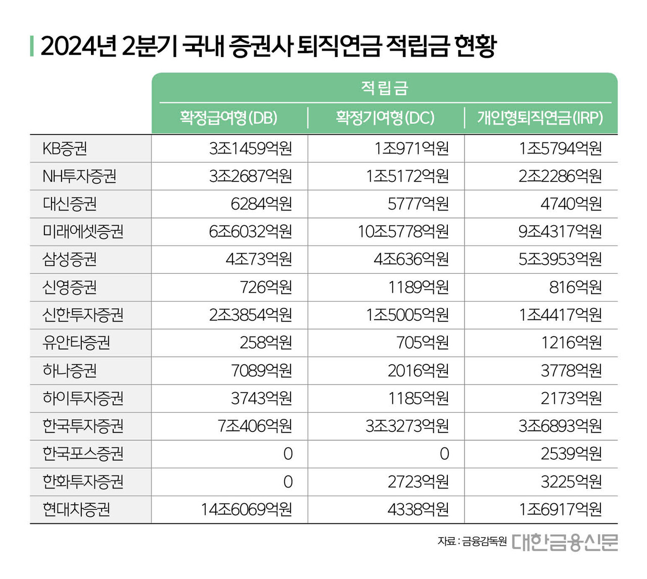 확정급여형(DB) 14조6069억원을 앞세운 현대차증권이 총 16조7324억원의 퇴직연금을 보유하면서 2위를 차지했다.