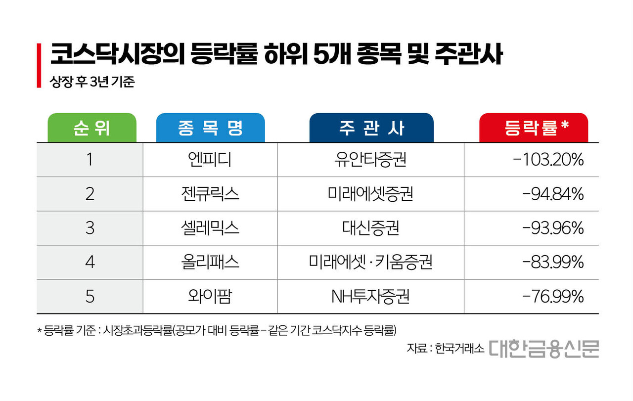 유안타증권이 코스닥 단독 상장 주관에서 시원찮은 성적을 거두고 있다. 주관사의 핵심 업무 중 하나인 사후 관리에 소홀했다는 지적이다.