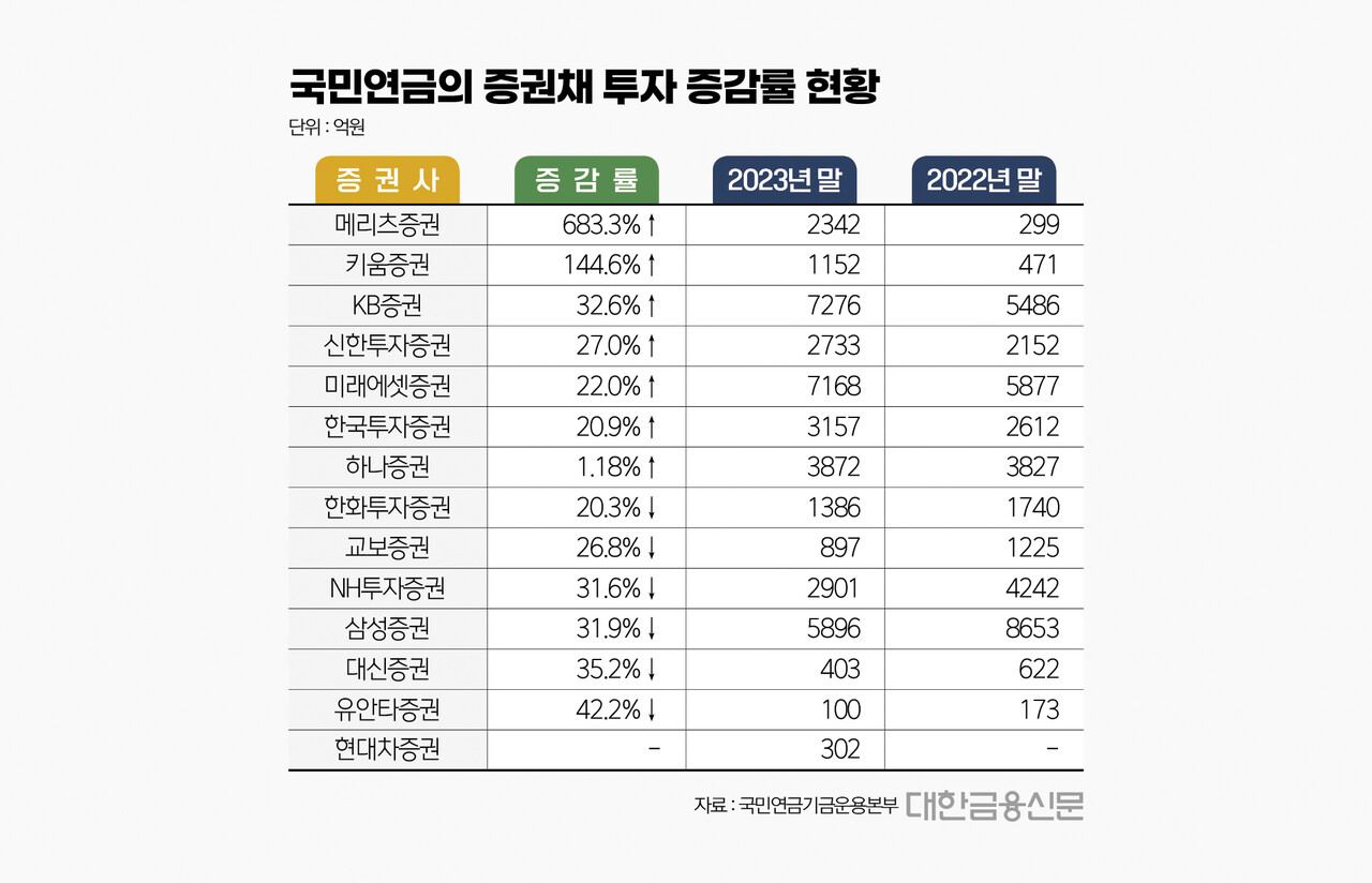 반면 국민연금은 삼성증권을 비롯한 일부 증권사의 채권 투자액을 줄였다.
