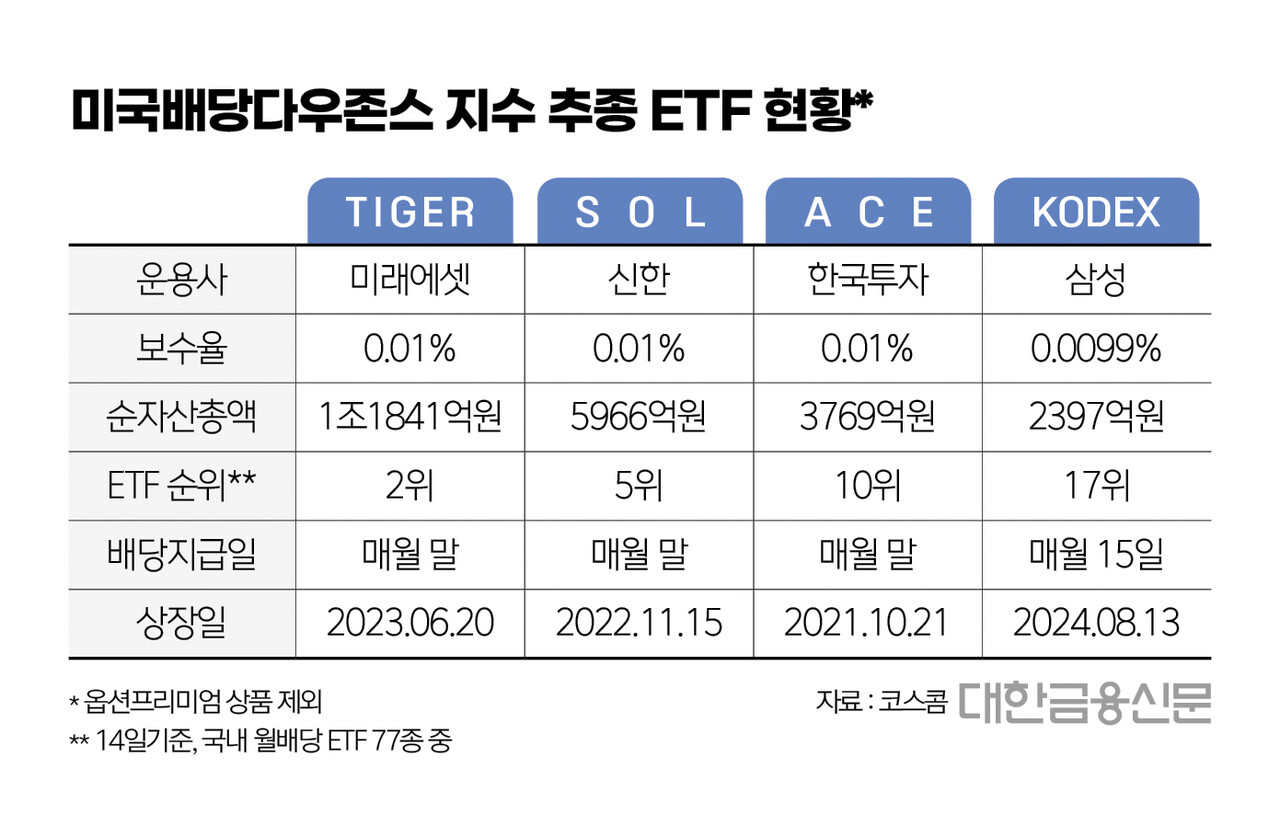 이날 기준 TIGER·SOL·ACE 미국배당다우존스의 순자산총액은 각각 1조1841억원, 5966억원, 3769억원으로 국내 월배당 ETF 77개 상품 중 순자산 최상위권에 이름을 올리고 있다.