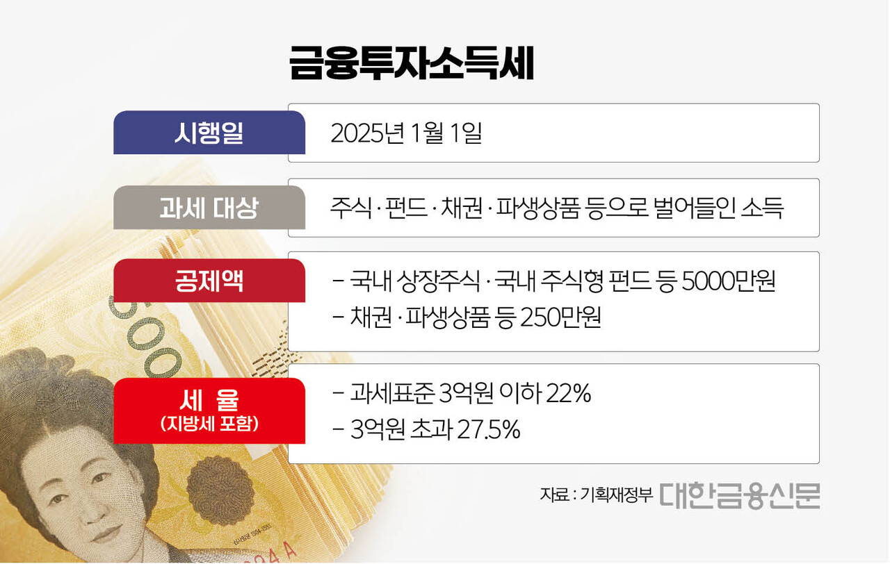 금투세는 주식·채권·펀드·파생상품 등 금융상품에 투자해 5000만원 이상 소득을 올린 투자자에게 20%(3억원 이상 25%)의 양도소득세를 부과하는 제도다.