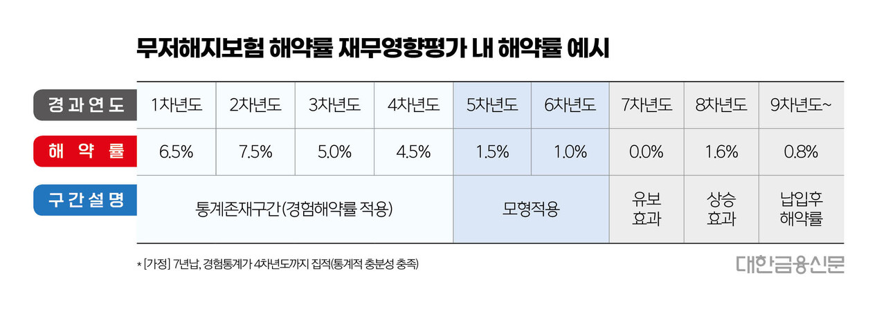 ‘단기납(7년납) 종신보험’을 예로 들면 2~4차년은 경험통계를 사용하고, 7차년도 해지율은 0.01%로 간주해야 한다. 이외 경험해지율이 존재하지 않는 5~6차년도에 로그-리니어 모형을 쓰면 낙관적 가정을 사용했던 보험사는 해지율이 크게 하락하게 된다.