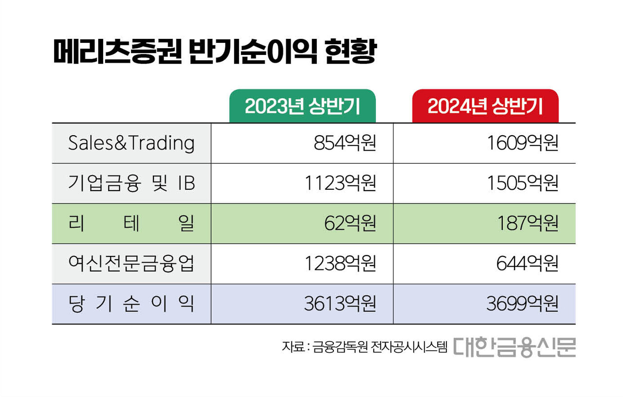 다만 리테일 부문의 성장세가 전체 당기순이익을 끌어올리진 못했다. 메리츠증권의 당기순이익에서 리테일이 차지하는 비중이 5% 안팎으로 미미했기 때문이다.